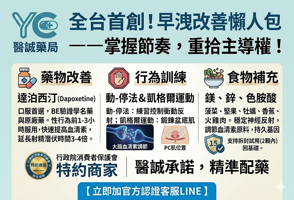 早洩不是一種羞恥,而是一項可以被科學優化的生理指標。在 YC 藥局,我們提供的不是一盒藥,而是一個「重拾自信的完整方案」。